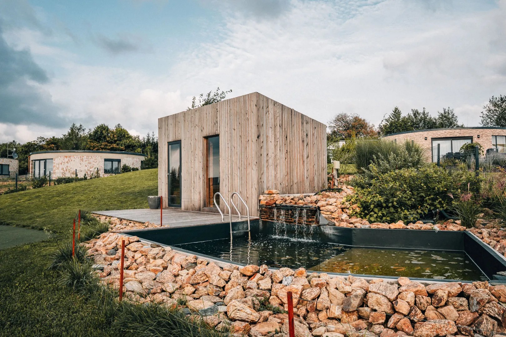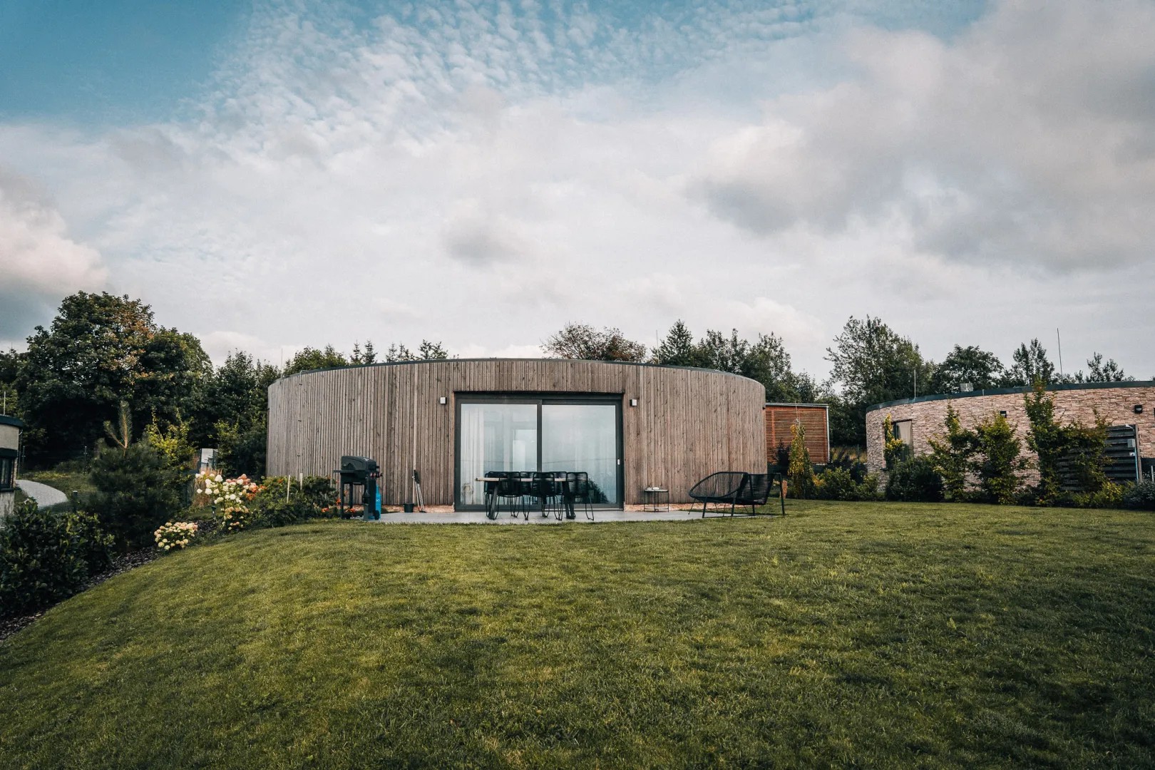 Oblé tvary domů zajišťují dostatek slunečního světla po celý den, panoramatický výhled do krajiny a snadný bezbariérový přístup do jednotlivých místností.
